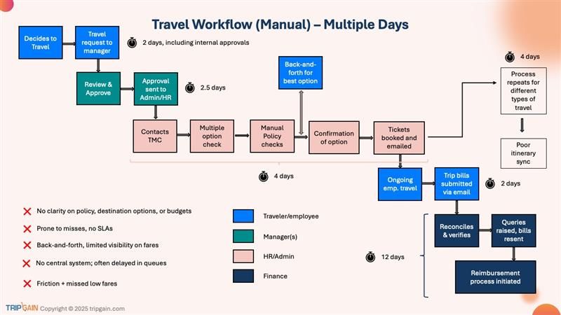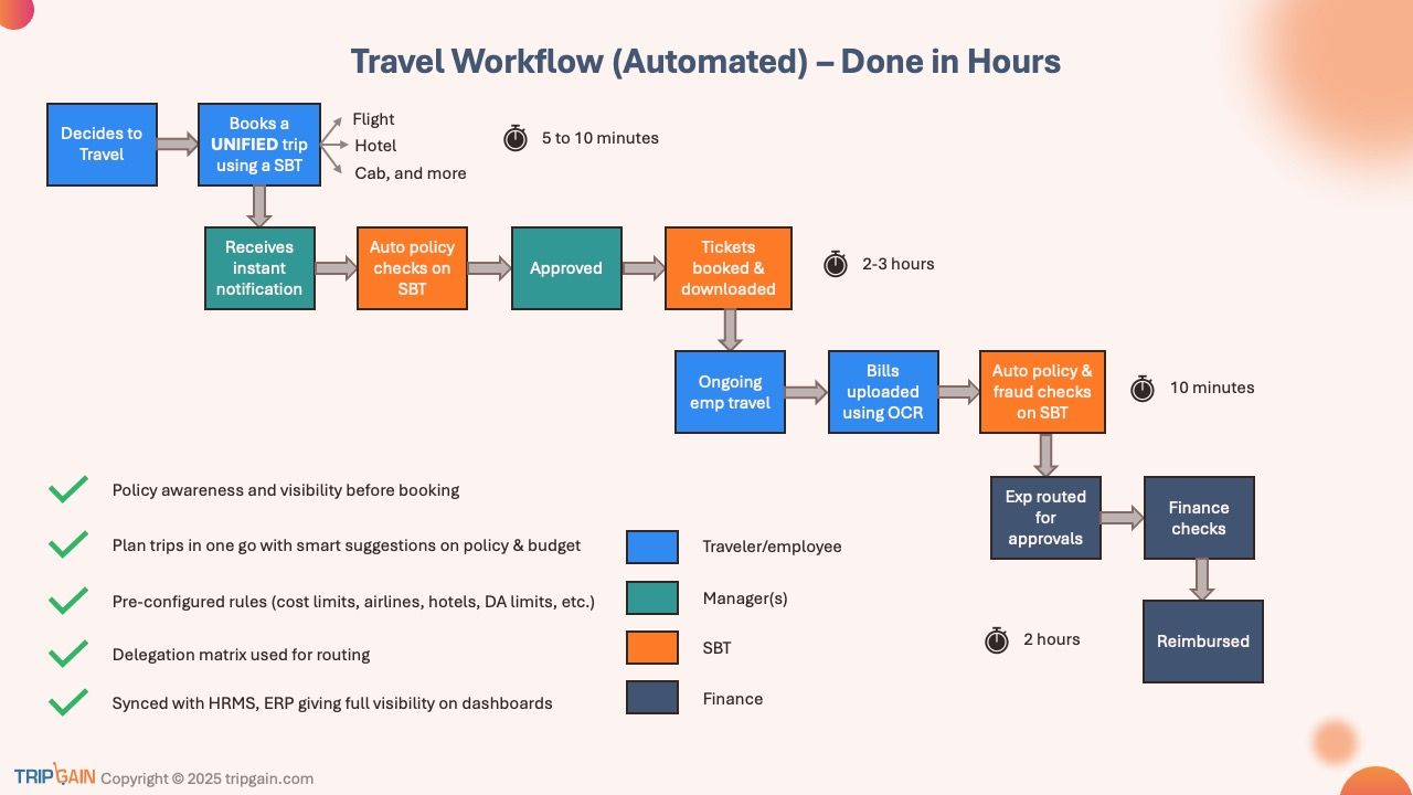 An enterprise travel policy is not just a document, it is a governance mechanism tied to roles, hierarchies, and spend entitlements. Yet, despite most organizations having formal policies, nearly 70% still enforce them manually, relying on emails and spreadsheets that slow approvals and increase compliance risk. When travel and expense systems are not integrated with HRMS, approval rules based on job grade, cost center, or reporting structure must be updated manually, leading to delays, exceptions, and policy leakage.