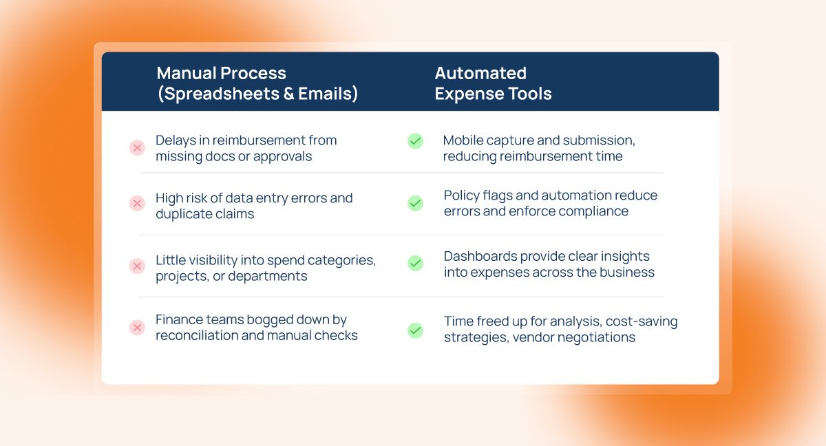NetSuite's 2025 industry trends report states that automated expense management systems are redefining how SMEs manage costs and gain compliance. Powered by AI, predictive analytics, and mobility, these platforms automate mundane tasks such as receipt capture and expense tagging, alert possible policy infractions prior to submission, and accelerate approval and reimbursement processes. This modernization not only eliminates errors and missing receipts by hand but offers real-time visibility for leaders, enabling wiser spending, quicker cash flow, and better compliance even as businesses grow and work patterns become hybrid and distributed. Most SMEs continue to use spreadsheets and email to manage expenses, but this causes lost receipts, late reimbursements, duplicate claims, and poor visibility into where money is going. Finance staff spend hours in reconciliation, and leadership has no visibility at the client or project level of spend.