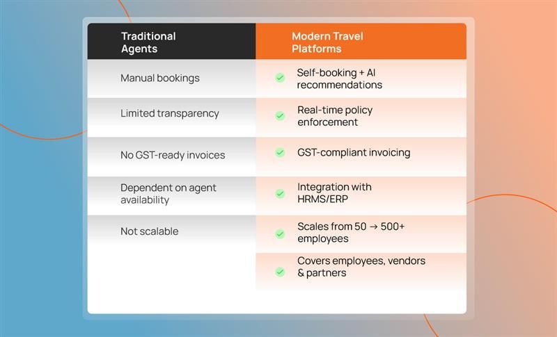 Basic self-booking tools: Inexpensive and simple to implement, but absence of policy enforcement, GST adherence, and integration with expenditure administration - suitable for startups, restrictive for SMEs.